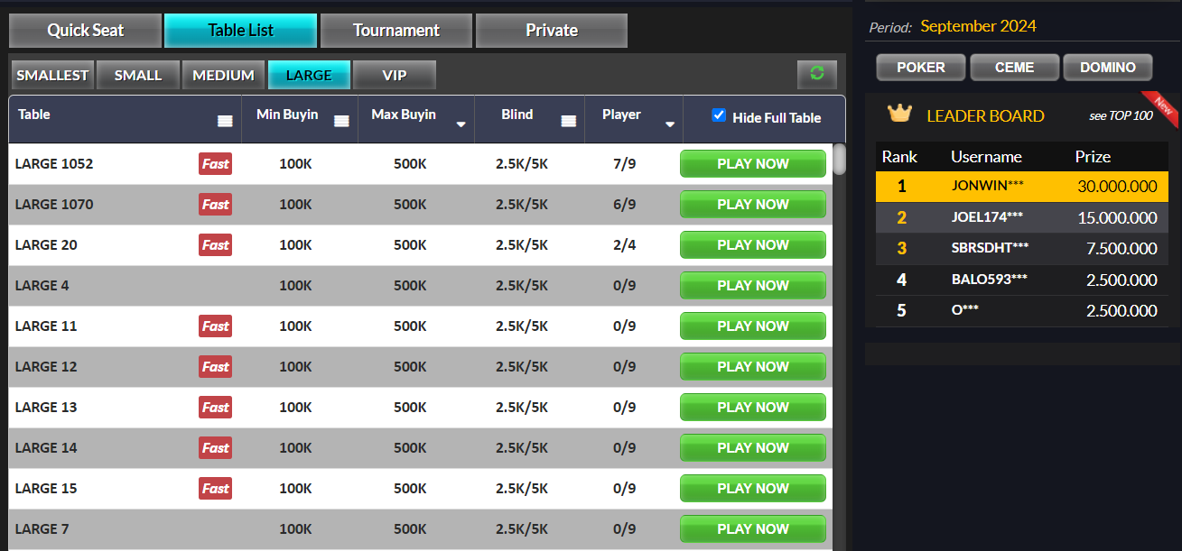 IDN Poker menawarkan berbagai meja dan permainan. Anda dapat memilih meja berdasarkan batas taruhan yang Anda inginkan:
